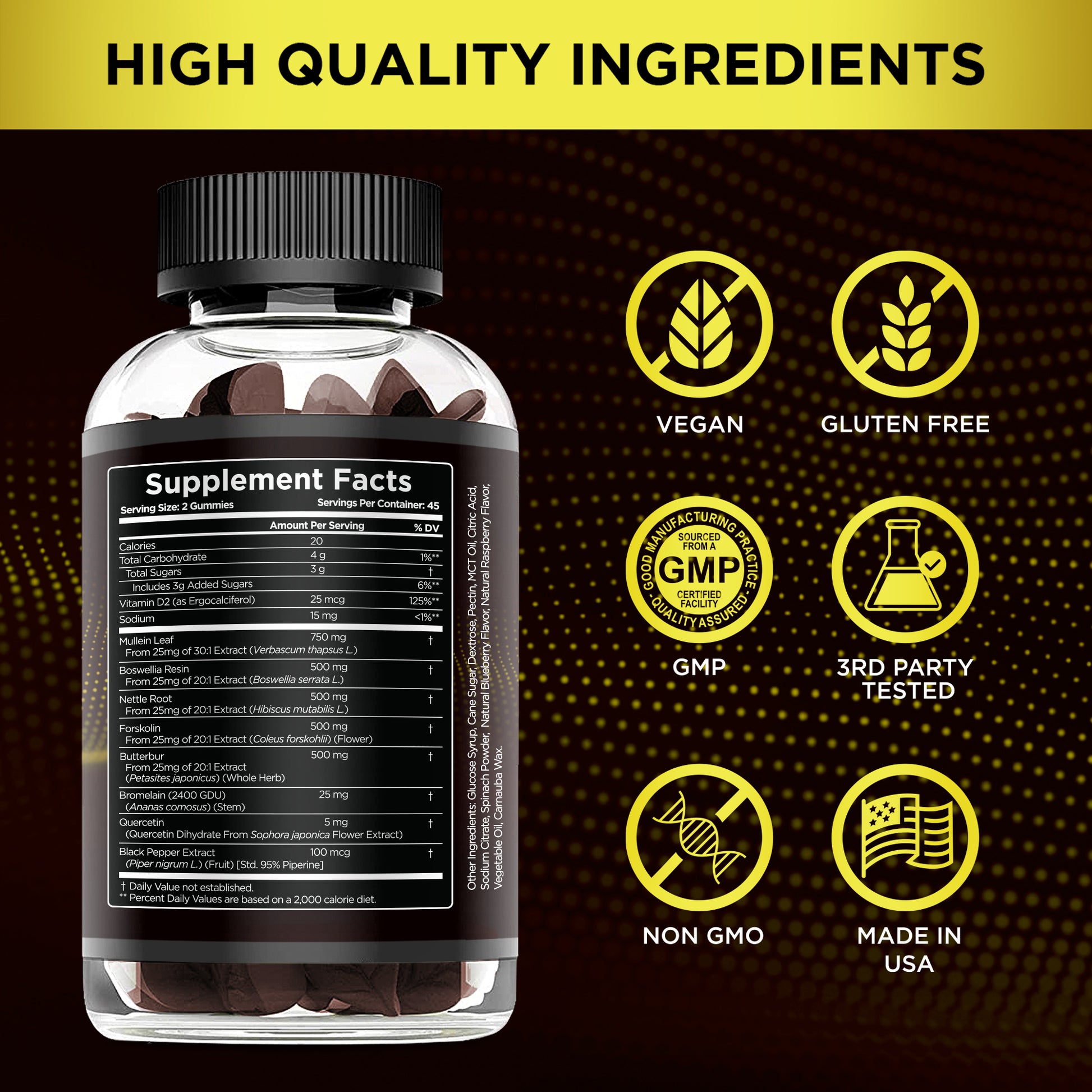 - 9-IN-1 COMPLEX: This Mullein gummy consists of 9 different herbs: Mullein, Boswellia, Nettle Root, Forskolin, Butterbur, Bromelain, Quercetin & Black Pepper Extract.*